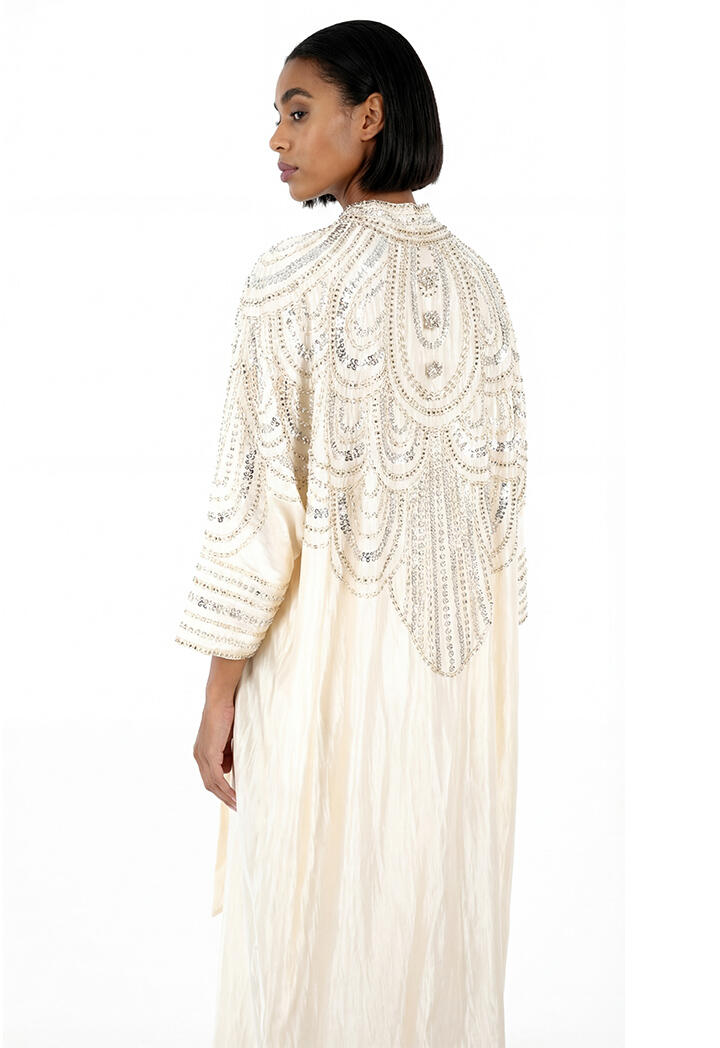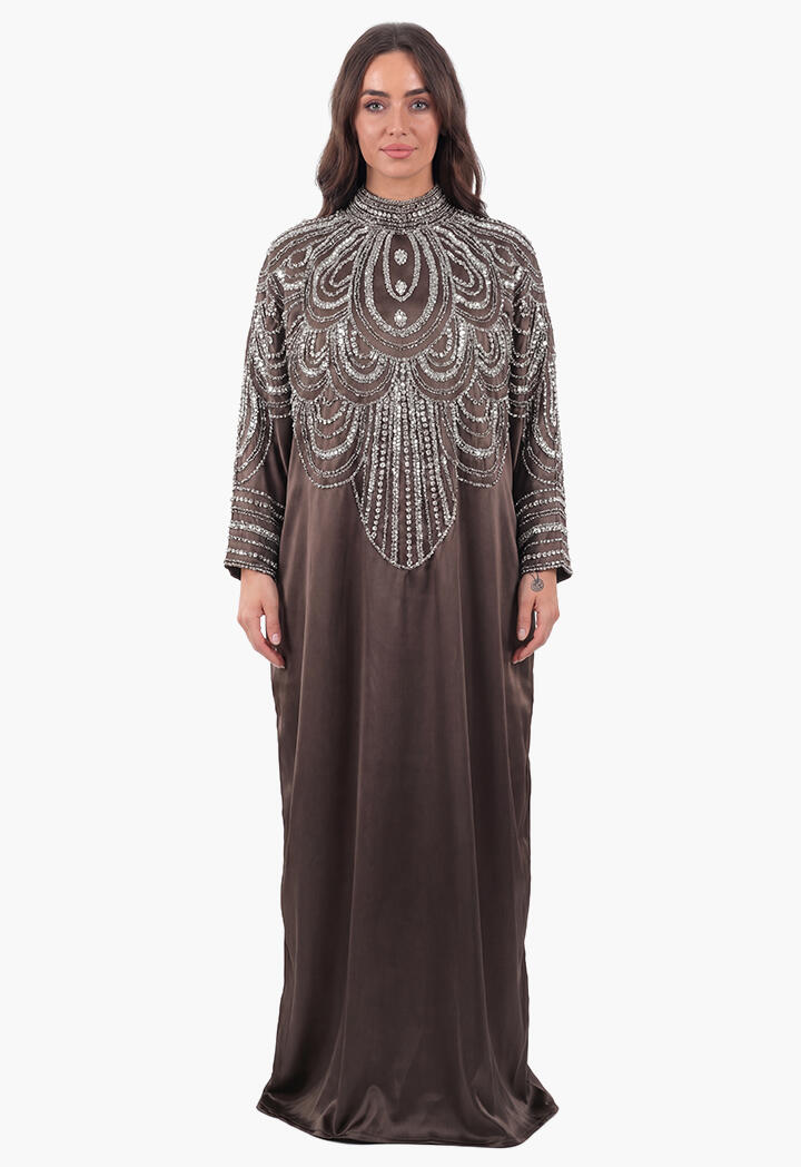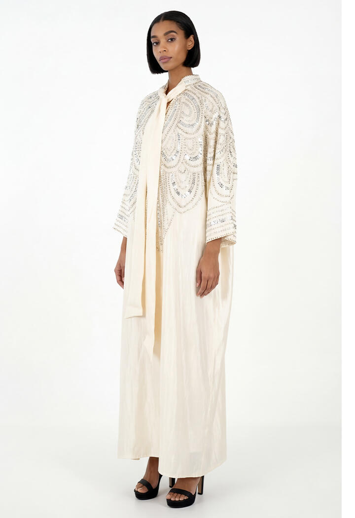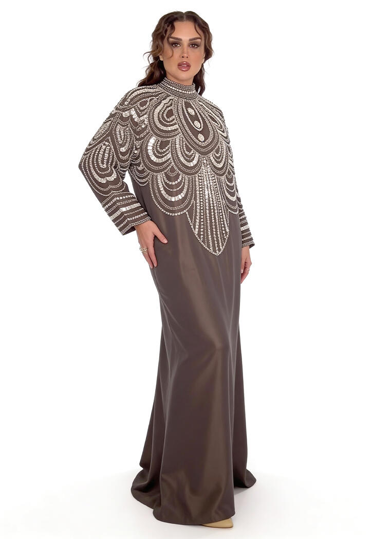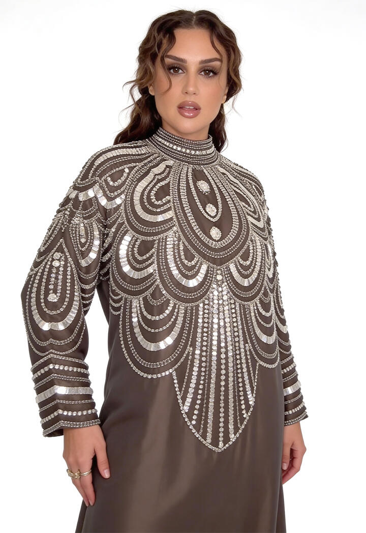 الرئيسيةدراعة ماكسي مطرزة باللؤلؤ والكريستالدراعة ماكسي مطرزة باللؤلؤ والكريستال0الوصفدراعة ماكسي بياقة عالية أنيقة، مزينة بتطريز كثيف من اللؤلؤ والكريستال بتفاصيل هندسية راقية، تمنحك إطلالة ملكية ملفتة، مثالية للسهرات الرمضانية.اللونموكاكريمىأخضر فاتحكحليعنابي